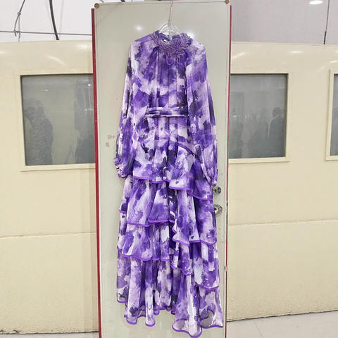Europese Amerikaanse Retro Print Zware Ruche Chiffon A-Lijn Jurk Grote Zoom Casual Inclusief Riem-Echte Standaard Cross-Border Shirt