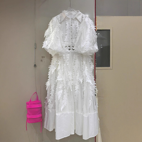 2025 Lente Herfst Nieuwe Stijl Single-Breasted Retro Borduurwerk Holle Jurk Imperium Effen Studs Revers Lantaarn Mouw