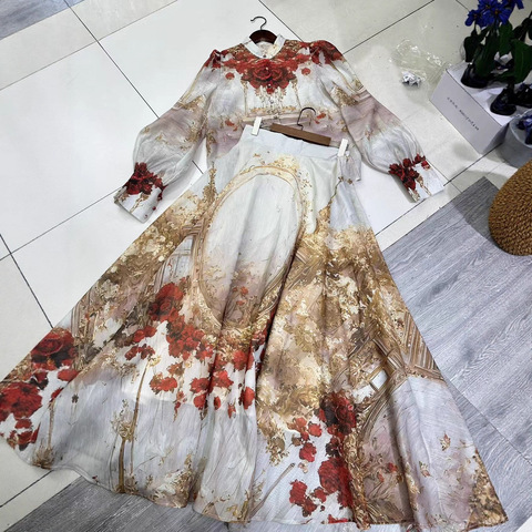 2025 phong cách mới Úc xuyên biên giới đơn ngực kỳ nghỉ Hoa Ve áo in tay áo đèn lồng dài sàn có tính năng