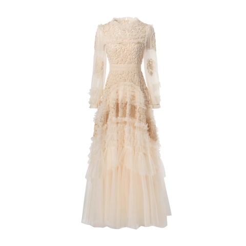2025 mùa xuân mới của phụ nữ ăn mặc giản dị duyên dáng thêu công nghiệp nặng lưới dài tay áo voan xuyên biên giới